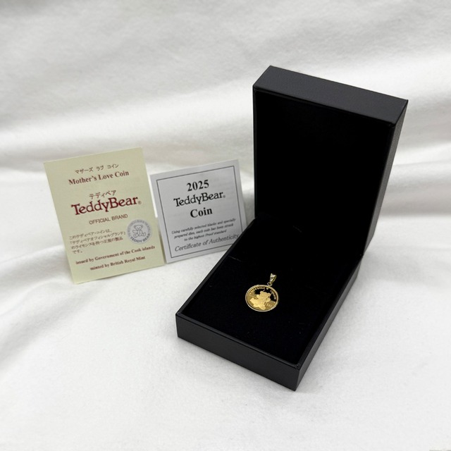 英国王立造幣局(ロイヤルミント)製の世界限定1000枚ティディベアコインをペンダントトップに仕立てました。 2025年の"ブランコに乗ったティディベア” 純金コインを18金のペンダント枠で囲い素敵なコインペンダントに!コインは1/30オンスの純金コイン。ペンダント枠は18金。表裏両面をお楽しみいただけるリバーシブルデザイン。 金貨:純金 1/30オンス 約1.03g、ロイヤルミント(イギリス王立造幣局)製造、イギリス連邦王国加盟クック・アイランズ政府発行 金貨直径:約12mm ペンダント枠:K18約0.2g ペンダント大きさ:約18×12mm(バチカン含む) ギャランティカード(品質保証書) オフシャルライセンス証明カード ケース